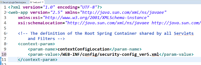 security-config_ver5.xml로 변경한 후 web.xml에서 security-config_ver5.xml를 인식할 수 있도록 수정합니다.