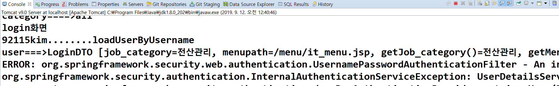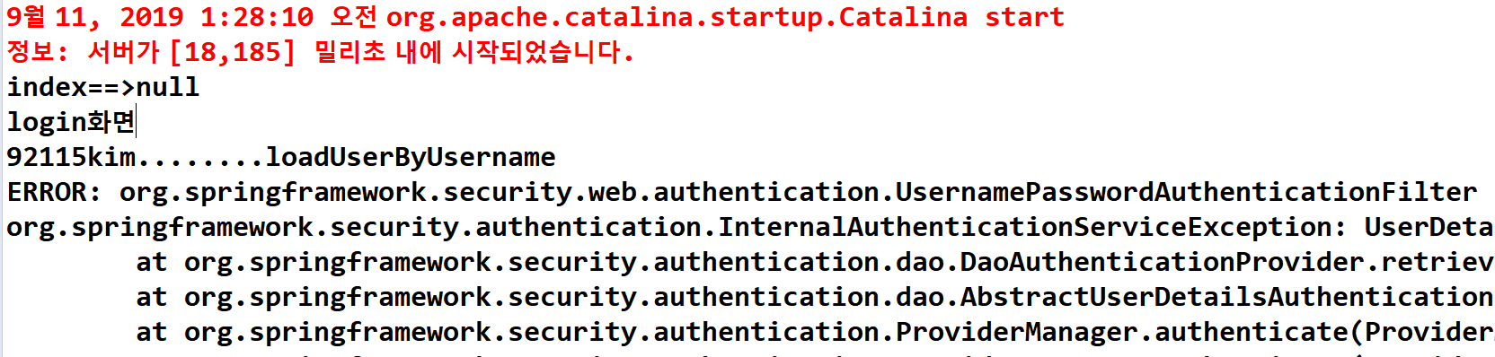 아직 인증 처리를 하지 않았고 loadUserByUsername메소드에서 null을 리턴하기 때문에 UsernamePasswordAuthenticationFilter에서 InternalAuthenticationServiceException이 발생하고 있습니다.
