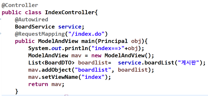 인증된 정보가 어떤 타입으로 실행되는지 확인하기 위해 최초로 실행되는 /index.do가 정의된 IndexController의 main메서드에 매개변수를 추가합니다.