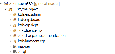 DB에서 인증 처리를 하기 위해 UserDetailsService클래스를 커스트마이징 해야 합니다. spring security 인증 처리에 관련된 클래스를 저장하기 위해 "ktds.erp.emp.authentication"패키지를 작성합니다.