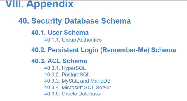 인증 화면에서 입력받은 데이터가 DB에 저장된 데이터인지 검증하는 작업을 해보았습니다. 이 과정에서 간편하게 각 사용자별 권한을 컬럼으로 추가하고 작업을 해 보았는데요. 사실 권한에 대한 관리는 간단하지 않습니다. 그룹별로 권한을 부여하고 관리하거나 사용자별로 관리할 수 있는데 spring.io사이트의 "Appendix" 부분에 보면 40 chapter에 "Security Database Schema"부분에 정리가 되어 있습니다.