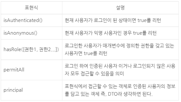 spring security태그 <se:authorize> 엘리먼트를 이용해서 작업하며 access속성에 EL함수를 정의하여 작업합니다.