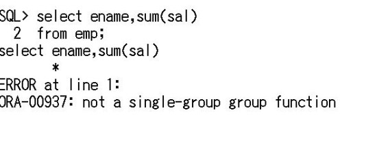 select절에 일반 컬럼과 그룹함수를 같이 쓸 수 없습니다. 일반 컬럼은 모든 레코드 수별로 출력되려고 하지만 그룹함수는 그룹별 작업하려 하므로 같이 쓸 수 없습니다. 단, group by를 적용하여 group으로 묶기 위해 사용한 컬럼은 사용할 수 있습니다. select절에 일반컬럼과 같이 사용하면 다음과 같이 에러메시지가 나타납니다.