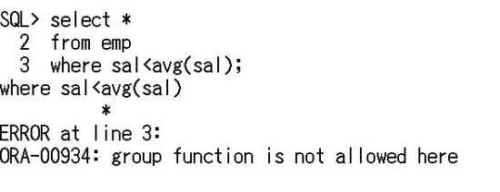 where절은 모든 행별로 조건을 검색하므로 그룹함수의 속성과 어울리지 않습니다. 따라서 where절에서는 그룹함수를 사용할 수 없습니다. where절에 사용하는 경우 다음과 같이 에러메시지가 나타납니다.