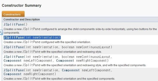 API를 열고 javax.swing패키지를 선택하면 JSplitPane의 생성자를 확인할 수 있습니다.