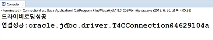 메시지에 같이 출력되어 있는 연결객체의 정보를 보면 oracle.jdbc.driver.T4CConnection객체인 것을 확인할 수 있습니다. 여러분들께서 아시는것처럼 Connection은 인터페이스입니다. 우리가 사용하는 DBMS가 오라클이고 오라클드라이버를 인식시키고 로딩했기 때문에 내부에서 동작하고 실행되는 API는 오라클에서 제공한 라이브러리 즉, ojdbc6.jar에 있는 클래스들이겠죠?