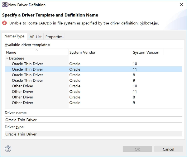 "New Driver Definition"버튼을 누르면 오라클의 버전을 선택하는 화면으로 전환됩니다. 11버전의 "Oracle Thin Driver"를 선택합니다.