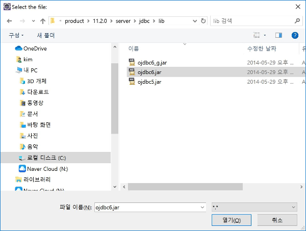 제거한 후 [Add JAR/Zip]을 눌러 오라클드라이버를 등록하도록 하겠습니다. 우리는 오라클 express버전을 설치했으므로 "C:\oraclexe\app\oracle\product\11.2.0\server\jdbc\lib"에서 ojdbc6.jar를 선택하여 등록합니다. Standard Edition이나 Enterprise Edition을 설치했다면 경로가 또 달라질 것입니다. 적절하게 선택하도록 합니다.