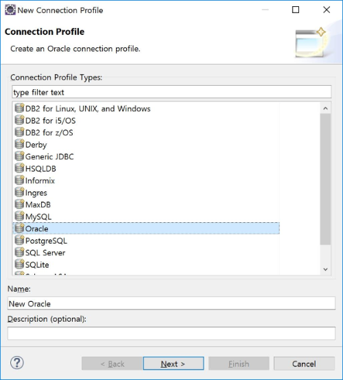 오라클을 이클립스에서 사용하기 위해 등록하는 첫 번째 과정으로 사용하고 싶은 DBMS의 종류를 선택합니다. 우리는 오라클 ex버전을 사용하니 "Connection Profile Types"목록에서 "Oracle"을 선택해야 겠죠? 이때 "Name:"의 기본 설정값인 "New Oracle"을 원하는 이름으로 변경해도 좋습니다.