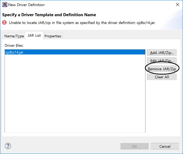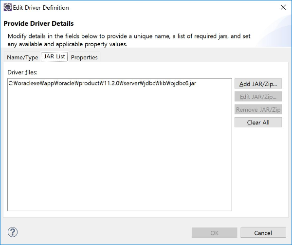 [JAR List]탭을 눌러 실제 드라이버 파일을 등록해야 합니다. 드라이버 파일은 제조사 홈페이지에서 다운로드 받아야 합니다. 우리는 오라클을 설치했으므로 오라클 설치 폴더에 있는 드라이버를 사용할 것입니다. 우리 드라이버파일은 ojdbc6.jar파일이죠? 잘못 등록되어 있는 드라이버인 ojdbc14.jar파일은 [Remove JAR/Zip]버튼을 눌러 제거한 후 다시 등록합니다.