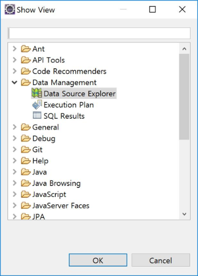 [Show View]대화상자가 화면에 나타나면 "Data Management"의 "Data Source Explorer"를 선택하고 [OK]버튼을 누릅니다.