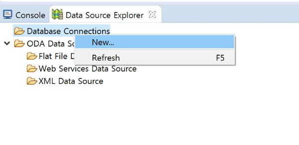 우선 "Database Connections" 아이콘을 선택하고 마우스 오른쪽 버튼을 눌러 단축 메뉴가 나타나면 [New...]를 선택합니다.