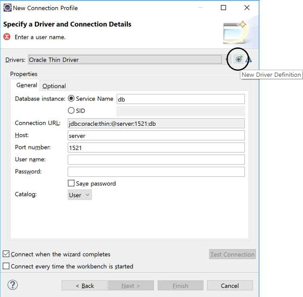 [Next]버튼을 눌러 나타나는 단계는 이클립스 내부에서 오라클을 접속할 수 있도록 드라이버와 연결문자열을 완성하기 위해 값을 지정하는 화면입니다. 지금은 "Drivers"목록에 설정된 드라이버가 있지만 처음 등록할때는 "Drivers"목록에 아무것도 등록된 것이 없을 것입니다. 아래 그림과 같이 "New Driver Definition"버튼을 눌러 등록해야 합니다.