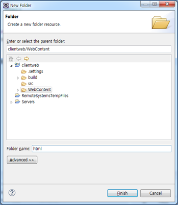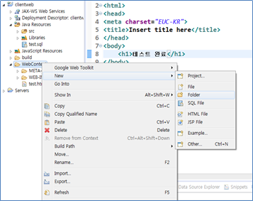 “WebContent” 폴더를 선택하고 마우스 오른쪽 버튼을 눌러 단축메뉴를 나타낸 후 [New]- [Folder]를 선택한다.