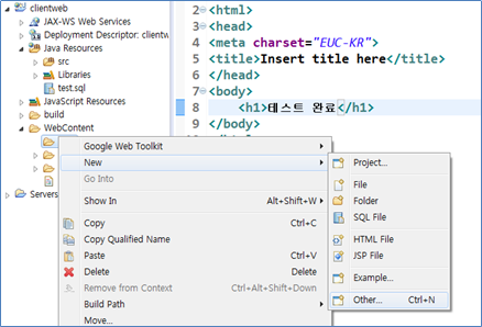 폴더가 생성되면 HTML파일을 추가할 것이다. “html”폴더를 선택한 후 오른쪽 버튼을 눌러 단축메뉴를 나타낸다. html문서처럼 자주 사용하는 컨텐츠는 바로 “New” 메뉴를 선택하면 메뉴에 추가가 되어 있지만 정식 방법은 다음과 같이 [New]-[Other..]메뉴를 선택하고 추가해야 한다.