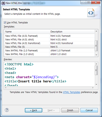 HTML4의 문법을 기본으로 살펴보지만 HTML5문서를 추가하여 작업할 것이다. “Select HTML Template”대화 상자에서 “New HTML File(5)”를 선택하고 [Finish]버튼을 누른다.