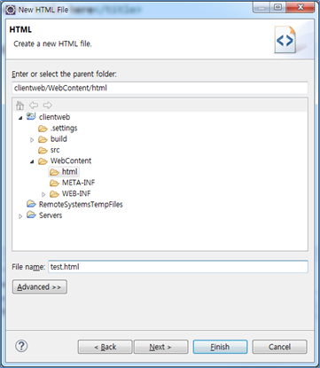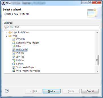 “New”대화상자의 “Web”그룹에서 “HTML File”을 추가한다. [Next] 버튼을 눌러 파일명을 “test.html”이라 입력한다.