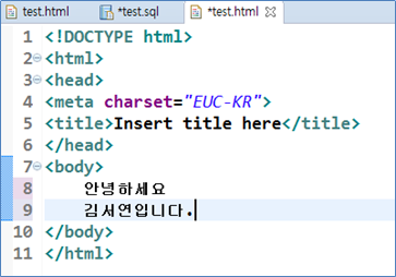 HTML문서가 추가되면 다음과 같은 문자열을 입력한다. 두 줄로 입력하기 위해 [Enter]키를 눌러작성한다.
