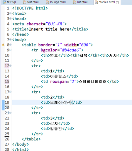 표에 삽입된 두 번째 row와 세 번째 row의 컬럼 에서 같은 문자열이 나오는 부분을 하나의 셀로만 표현하고 싶다면 row의 방향으로 셀을 병합해서 표현해야 한다. 셀을 병합하는 방법은 병합할 셀이 시작하는 <td>태그에서 “rowspan”을 이용해서 병합할 셀의 개수를 지정해야 한다. 또한 시작 셀을 남기고 나머지는 <td>를 정의할 필요가 없으므로 삭제한다.