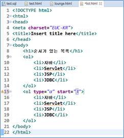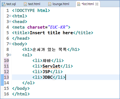 목록을 표현할 때 사용되는 태그로 순서가 있는 목록과 순서가 없는 목록을 표현할 수 있다. 순서가 있는 목록은 <ol></ol>로 표현하며 각 항목의 목록은 <li></li>로 표현한다. 새 HTML문서를 생성한 후 다음과 같이 작성한다.