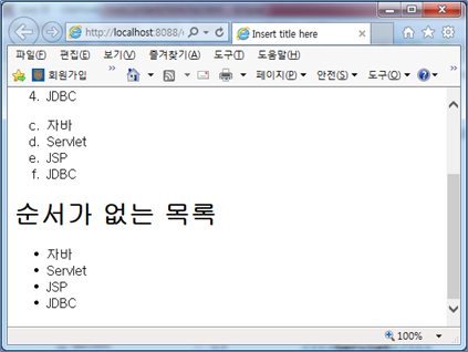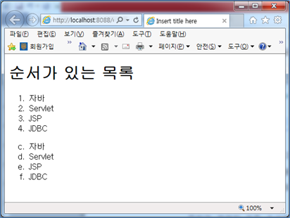 순서가 있는 목록에서 순서를 1,2,3…이 아닌 다른 유형의 순서로 변경할 수 있다. 위에서 작성한 코드에서 <ol></ol>코드를 복사하여 “type”속성을 추가하고 “a”로 지정한다.