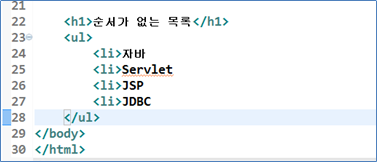 보통 순서가 없는 목록은 CSS를 적용하여 메뉴를 구성하거나 테이블처럼 나타낼 수 있다. 다음과 같은 코드를 작성한다.