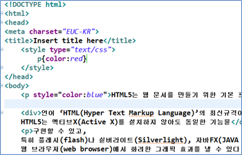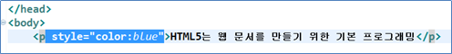 태그 내에 “style”속성을 정의하고 “”안에 속성명과 속성값을 정의한다.