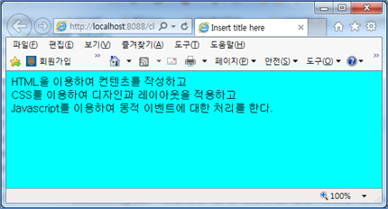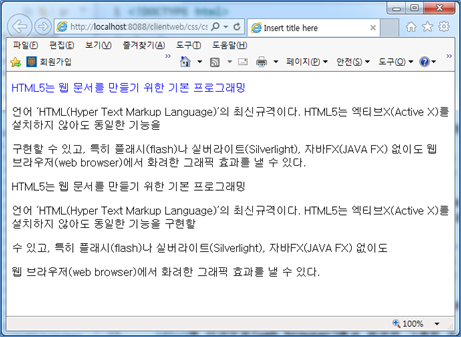 정의한 CSS외부 문서는 <link>태그를 이용하여 연결하며 다음과 같은 방법으로 연결한다. 실행하면 CSS가 적용된 결과가 나타나는 것을 확인할 수 있다. 이렇게 외부 문서를 이용하여 공통 서식을 적용한 후 연결하여 작업하는 방법이 CSS에서 가장 많이 사용되는 방법이다.