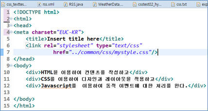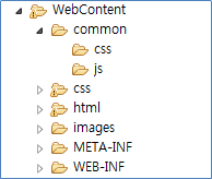 CSS속성을 외부 문서에 정의한 후 적용하는 방법이 가장 많이 사용되는 방법이다. 사이트를 제작하면서 모든 웹 페이지에 동일한 서식을 적용하기 위해서 이 방법을 이용해야 한다. 우선 외부 파일을 저장할 폴더를 “WebContent”폴더 아래 다음과 같은 구조로 작성한다.
