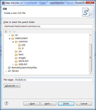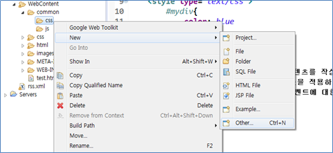 공통의 서식이므로 “common\css”폴더를 작성하고 외부 CSS파일을 저장할 것이다. 외부 CSS파일의 확장자는 “.css”이며 추가된 “css”폴더를 선택하고 단축메뉴를 나타낸 후 [New]-[Other]를 선택한다.
