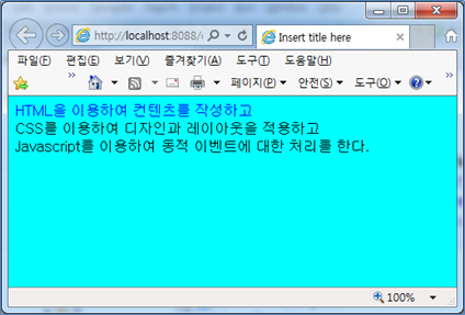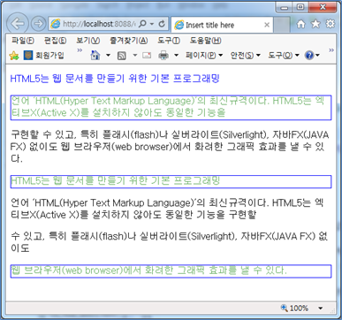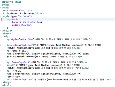 실행하면 결과가 나타나며 <p>태그와 <div>태그 서로 선언된 태그는 다르지만 모두 class명을 “myblock”으로 선언했기 때문에 동일한 서식이 적용되는 것을 확인할 수 있다.