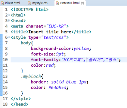 지금까지 선택자와 CSS적용방법을 설명하며 살펴보았던 CSS속성에 대해서 살펴보자. 우선 “csstest01.html”문서를 열고 <body>태그에 CSS속성을 다음과 같이 정의한다