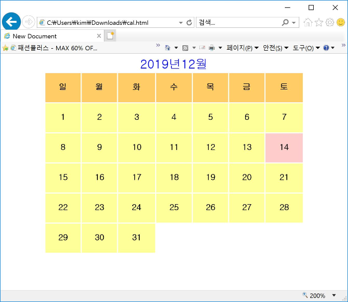빈 셀을 테이블로 출력하고 1일의 요일부터 숫자가 출력되도록 작성한다.