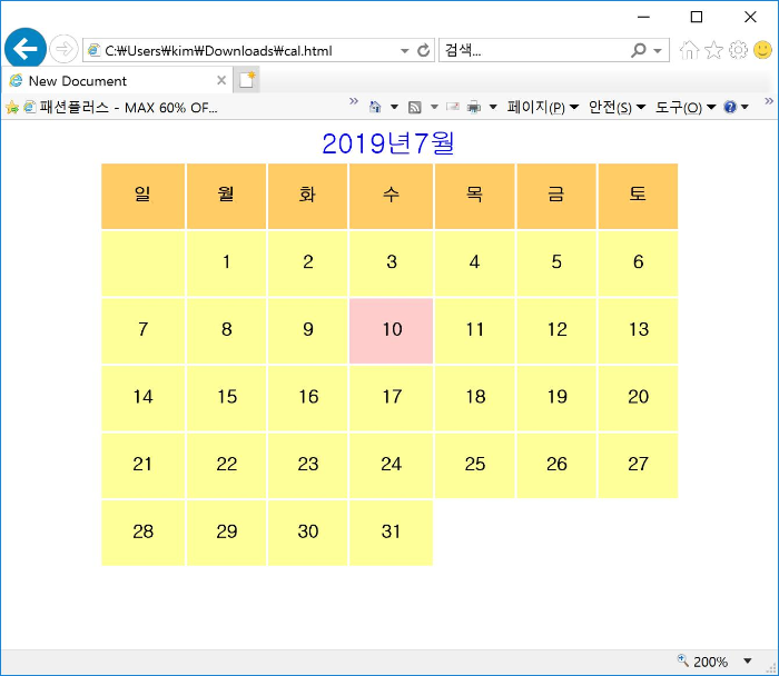 다음과 같은 형태로 자동으로 해당 월과 일을 반영한 달력이 출력되도록 작성합니다. 매월 마지막날을 배열로 선언해서 작업해야 편하므로 Array객체와 Date내장객체를 이용하여 작업합니다.