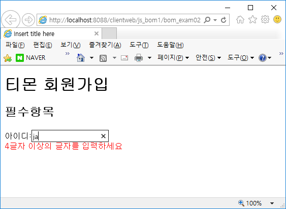 - 아이디는 4글자 이상이어야 하므로 4글자 미만으로 입력되었을때 는 다음과 같은 메시지가