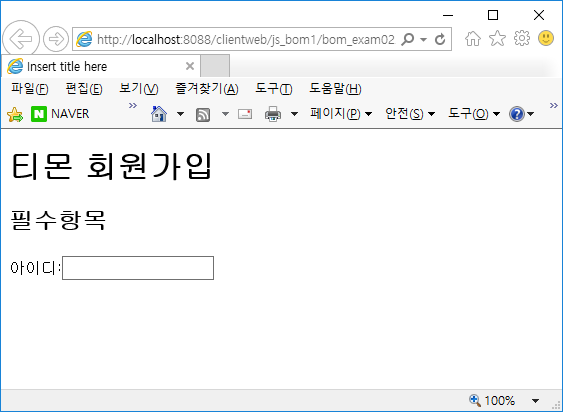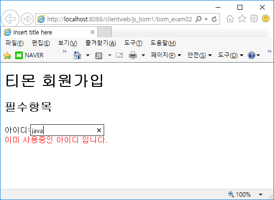 - DB에 존재하는 아이디인 경우 사용할 수 없다는 메시지가 출력되어야 합니다. 그러나 DB연동하는 부분을 아직 배우지 않았으므로 아이디가 "java"인 경우 다음과 같이 메시지가 출력되도록 작업합니다.
