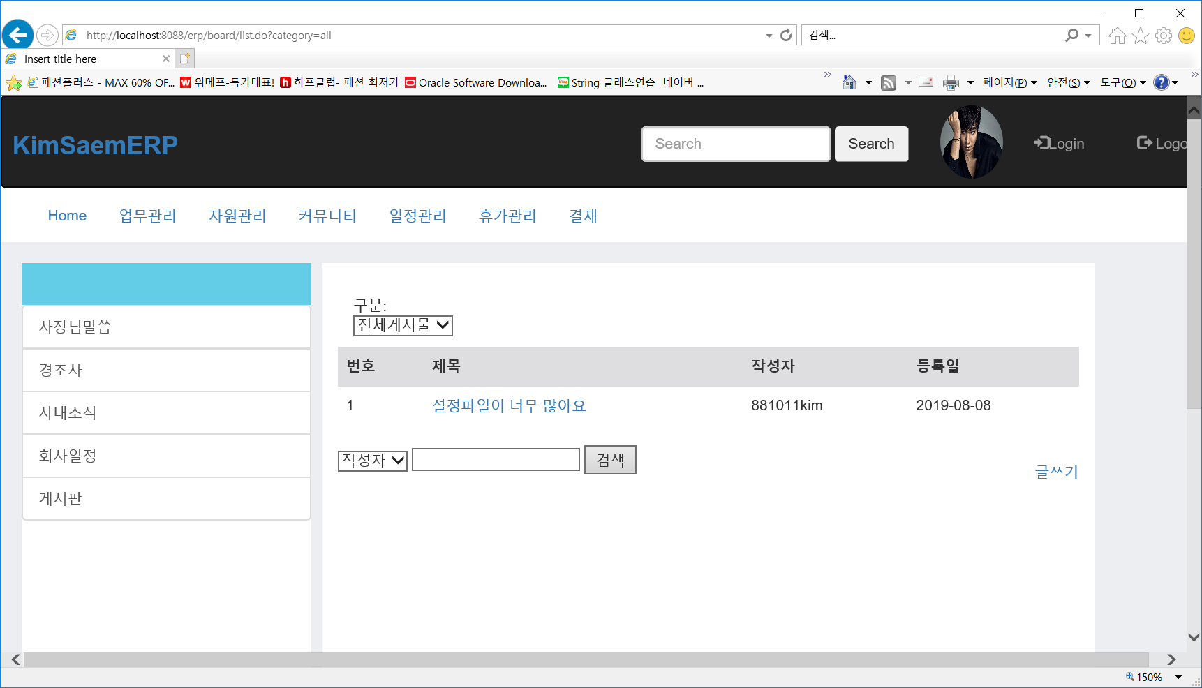 top.jsp에서 [커뮤티니]를 선택하면 다음과 같이 게시판에 등록된 글을 조회하여 목록으로 출력할 수 있도록 작업합니다.
