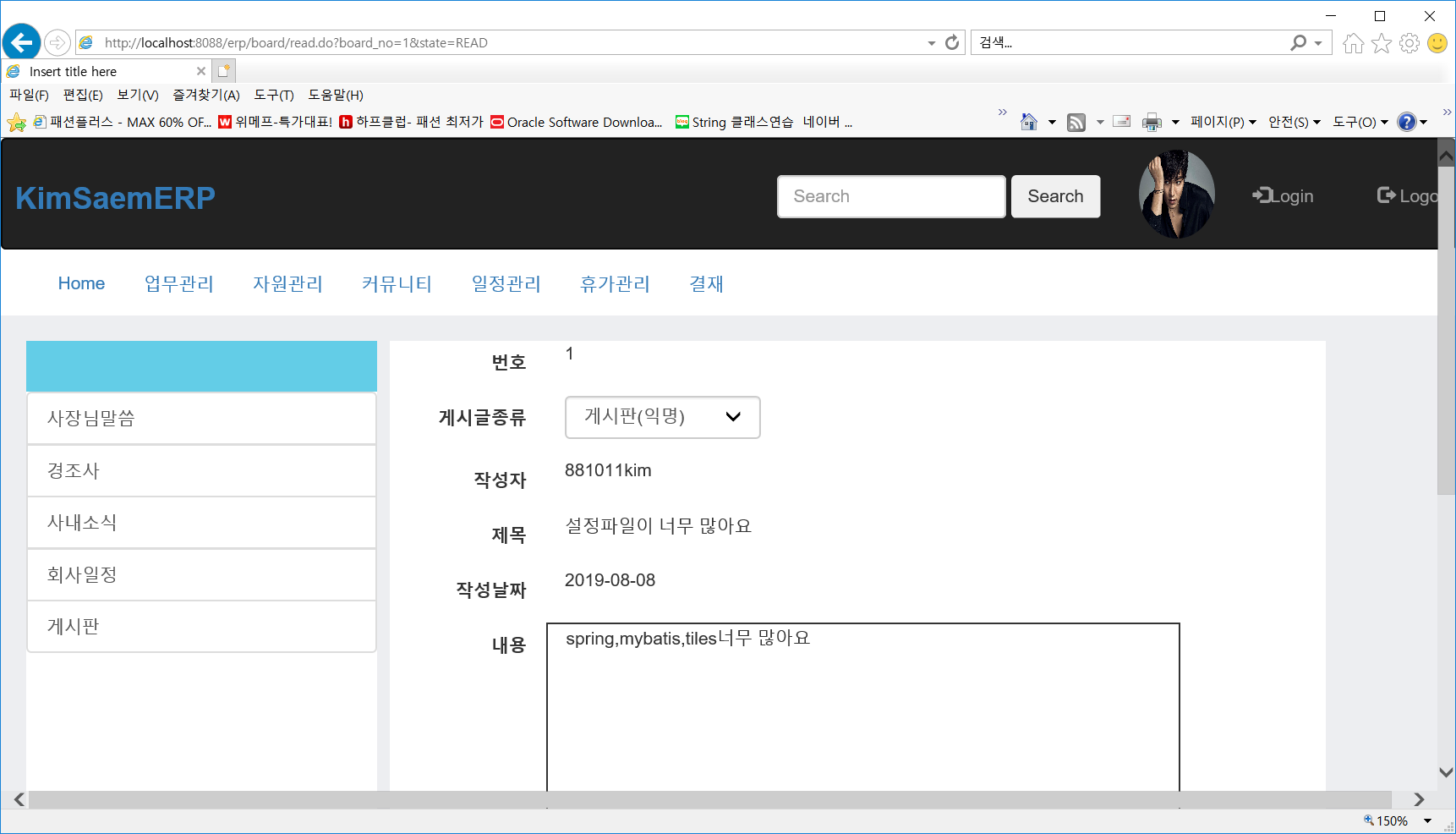 erp프로젝트에서 커뮤니티의 게시판 기능이 동작할 수 있도록 다음과 같은 조건을 만족하도록 작성하세요