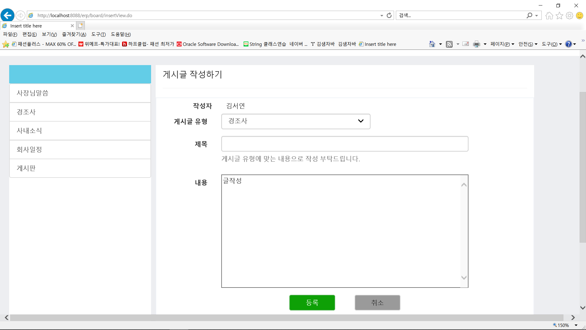 목록조회화면에서 "글쓰기"를 선택하면 다음과 같은 화면이 나타나며 등록될 수 있도록 작성하세요