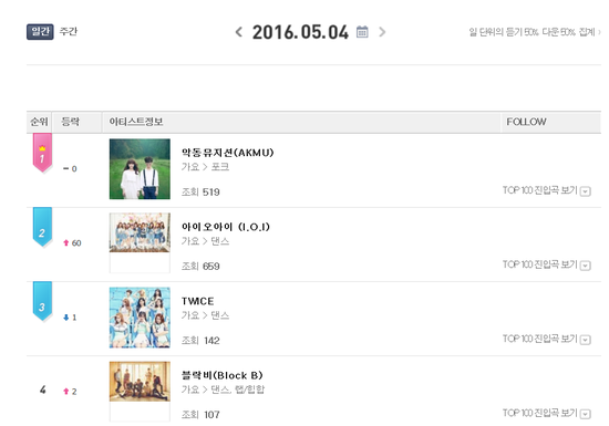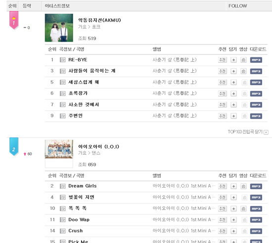 이 화면은 먼저 아티스트의 목록을 조회한 후 "TOP 100 진입곡"이라는 하이퍼링크를 클릭하면 보이는 화면으로, 서버 쪽에서 받아오는 데이터를 이용하여 보이도록 구성한 것입니다. 모든 아티스트 정보에서 아티스트명 아래쪽에 있는 링크를 클릭하면 수행되는 이 기능은 페이지의 새 로고 침 없이 즉, 이전에 요청했었던 내용이 없어지지 않고 처리가 됩니다. 내부적으로 어떤 기술을 써서 개발했는지 정확하게 알 수는 없으나 이러한 처리는 거의 Ajax기술을 이용하여 개발되어집니다.