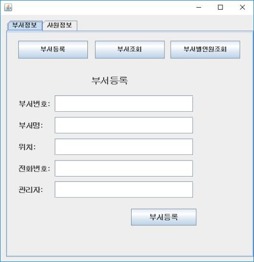 - 부서정보Tab은 부서등록,부서조회,부서별 인원조회를 할 수 있도록 CardLayout을 이용하여 구