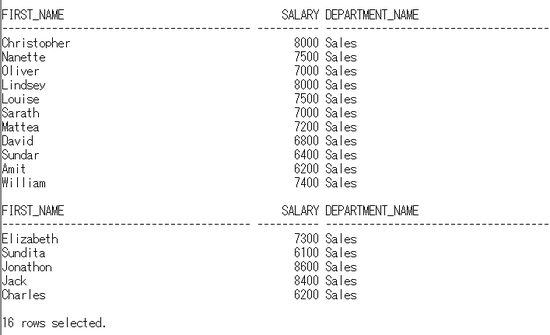 2.Sales’부서에 속한 직원의 이름(first_name), 급여(salary), 부서이름(department_name)을 조회하시오. 단, 급여는 100번 부서의 평균보다 적게 받는 직원 정보만 출력되어야 합니다.