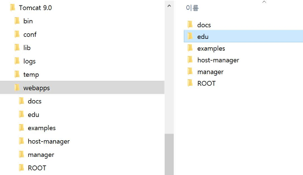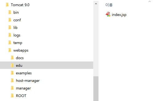 우선 서버가 인식하는 위치인 webapps를 선택한 후 “edu”이라는 이름의 폴더를 생성합니다.