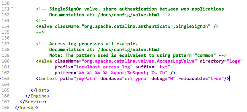 <Context>를 이용하여 등록하며 docBase는 실제 요청할 폴더의 경로를, path는 웹 상에서 요청하고 싶은 경로를 지정하면 된니다. sever.xml파일은 대소문자를 구분하며 닫는 태그를 반드시 명시해야 합니다.