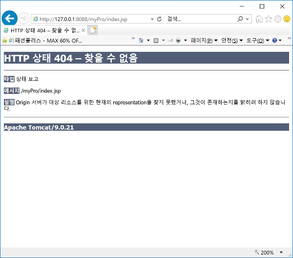 그러나 C:\mypro폴더는 서버가 인식하는 폴더가 아니므로 다음과 같이 요청한 경로를 찾을 수 없다는 응답 메시지를 보내옵니다. 404번은 요청 파일을 찾을 수 없다는 HTTP프로토콜의 응답 코드 이며 앞으로 웹 프로그래밍을 하면서 가장 많이 보게 될 화면 중 하나입니다.
