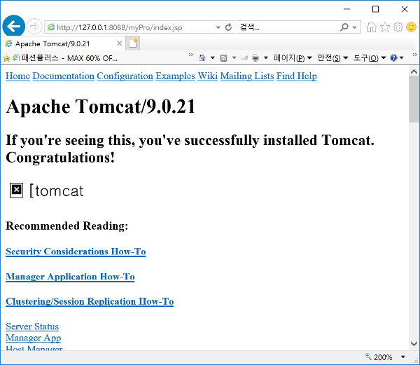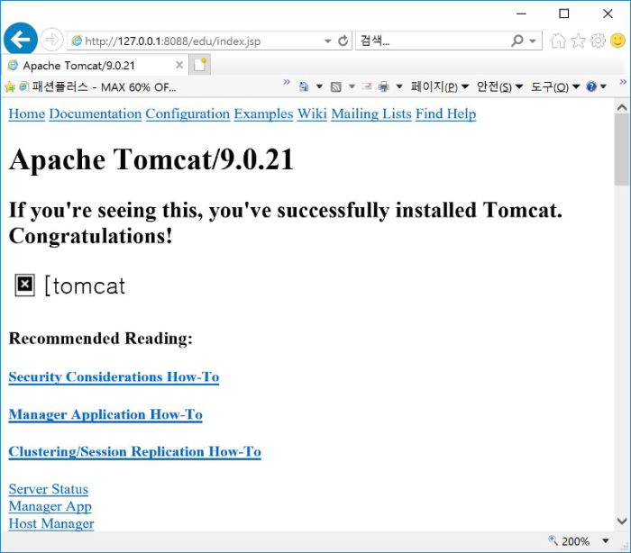 브라우저를 실행하고 http://127.0.0.1:8088/edu/index.jsp를 요청하겠습니다. copy하면서 이미지파일이나 서식파일을 copy하지 않았기 때문에 화면은 깨져서 나타나지만 요청하면 다음과 같이 응답화면이 실행됩니다.