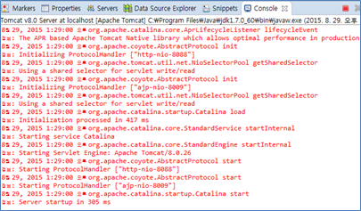 이클립스에서 실행되는 서버는 기본환경의 서버정보를 copy해 오는 것이므로 이클립스 밖에서 서버가 start되어 있으면 이클립스에서 서버를 사용할 수 없으므로 반드시 stop시키고 사용해야 합니다.