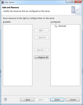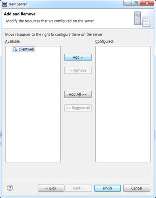 마지막으로 우리가 작성한 Dynamic Web Project인 clientweb을 서버가 인식하는 위치로 보내야 하는데 [Available]목록에 있는 “clientweb”을 선택하고 [Add]버튼을 눌러 [Configured] 목록에 추가되도록 합니다.