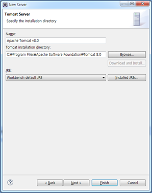 Tomcat이 설치되어 있는 홈 디렉토리를 [Tomcat Installation directory]의 [Browse]버튼을 누르고 선택합니다.