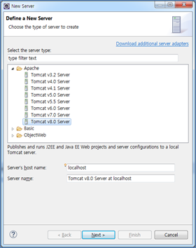 “New Server”대화 상자가 나타나면 [Apache]-[Tomcat v8.0 Server]를 선택하고 [Next]를 선택합니다.